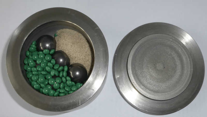 Coated tablets in a stainless steel grinding bowl, grinding balls and quartz sand