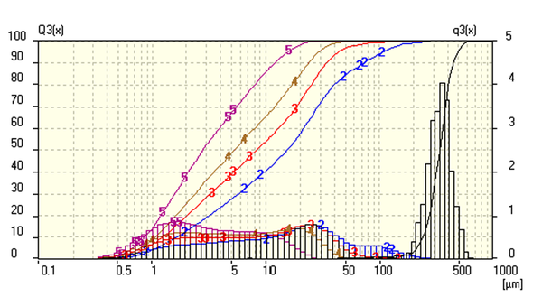 In tests with the Planetary Micro Mill PULVERISETTE 7 classic line, it was shown that lengthening the grinding time from 60 minutes to 240 minutes achieves practically no further increase in the fineness of the ground material. By exchanging the 10 mm grinding balls used for this test with balls approx. 1 mm in size, a significant increase in the fineness can be achieved after a short time.